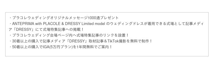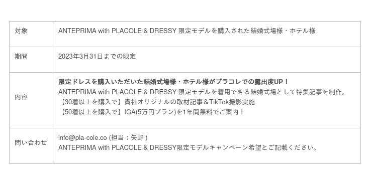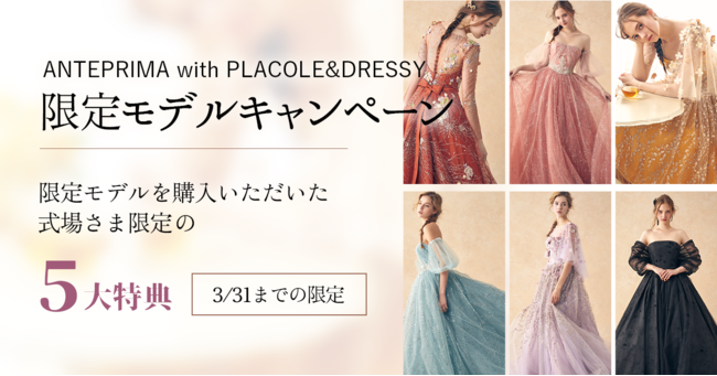 多くの花嫁に愛され続ける“ANTEPRIMA”のウェディングドレスコレクションと「花嫁の声をかたちに」をコンセプトに展開するPLACOLE&DRESSY の限定ドレスプロジェクト【 ANTEPRIMA with PLACOLE&DRESSY Limited model 】を記念してプラコレウェディング限定のキャンペーンをご案内。 キャンペーンポイント
