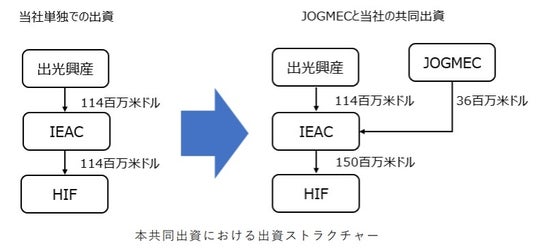 本採択を受け、当社は JOGMEC と出資基本契約を締結します。JOGMEC は当社の米国 子会社である Idemitsu Efuels America Corp.(以下、「IEAC」)を通じて、当社とともに HIF 社への共同出資(JOGMEC からは約 36 百万米ドルを出資)を行います。