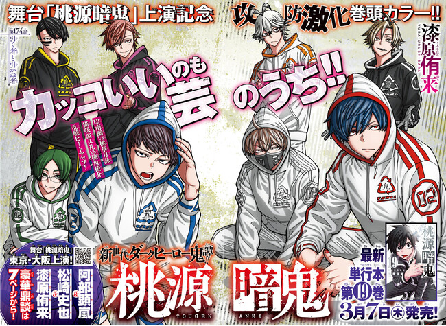 株式会社秋田書店(所在地:東京都千代田区、代表取締役社長:樋口茂)は、発行している週刊少年漫画誌『週刊少年チャンピオン』(編集長:松山英生)2月15日(木)発売の11号にて舞台「桃源暗鬼」上演記念で「桃源暗鬼」が表紙&巻頭カラーで登場することをお知らせいたします。「桃源暗鬼」限定QUOカード(2種)の応募者全員サービスも実施します。主演の阿部顕嵐さん、脚本・演出の松崎史也さんと著者・漆原侑来さんの豪華鼎談も掲載します。付録には「しらないこと研究会」SNS風クリアカードもございます。