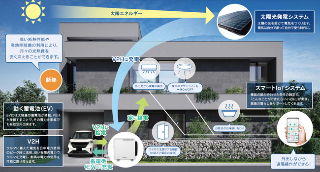 株式会社ヤマダホームズ(本社︓群馬県高崎市、代表取締役兼社長執行役員︓清村浩一)は、この度、ヤマダホールディングス 50 周年記念商品として、動く蓄電池(EV)を標準搭載し、太陽光発電システム、V2H、IoTを使って「創エネ・畜エネ・省エネ」を実現する近未来スタンダード住宅「YAMADA スマートハウス」を、2023年10 月14日(土)より販売開始いたします。