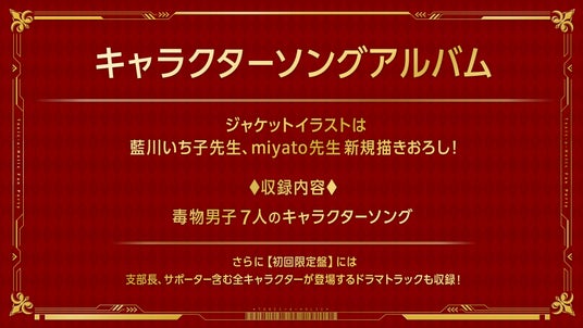 本アルバムには、未発表のヘムロック(CV:古川 慎)を含む、毒物男子7人全員のキャラクターソングを収録。