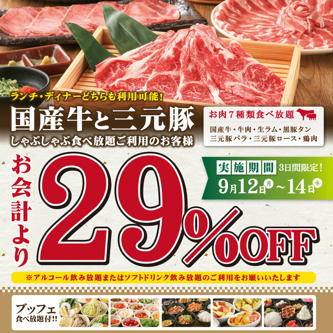 「しゃぶ食べ(三鷹北口駅前店・マルイ錦糸町店)」の東京都内2店舗で、令和4年9月12日(月)から14日(水)までの3日間限定で、 お得なセールを実施します! “国産牛と三元豚のしゃぶしゃぶ食べ放題コース”ご利用に限り、「肉(29)」にちなんでお会計より29%OFFします!「食欲の秋」にぴったりのしゃぶしゃぶ食べ放題をお得にご堪能ください!