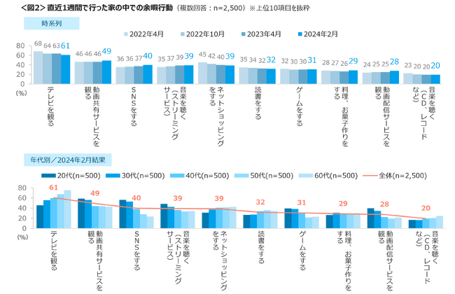 直近1週間の家庭内での余暇行動は、「テレビ」「動画共有サービス」「SNS」「音楽」「ネットショッピング」など。時系列では「動画共有サービス」「SNS」「音楽」「動画配信サービス」が増加傾向にある。2024年の結果を年代別にみると、20代・30代が多いのが「動画共有サービス」「SNS」「音楽」「ゲーム」「動画配信サービス」と、若い年代のテレビ離れが目立つ結果であった。<図2>