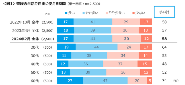 普段の生活で自由に使える時間は、多い計が全体で58%であり、最も余暇時間が多いのは60代、最も少ないのは40代であった。5類感染症移行前の2022年、2023年と比べても現在の余暇に使える時間に大きな変化はみられない。<図1>