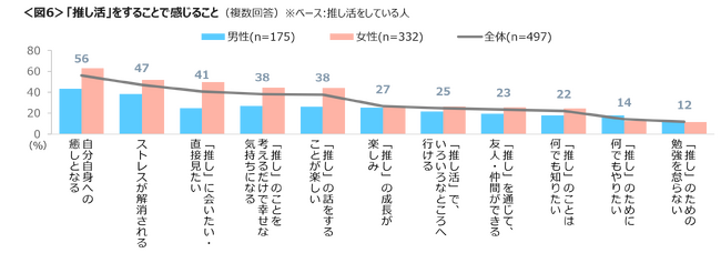 “推し活”をすることにより、「自分自身への癒し」「ストレスの解消」「推しに会いたい・直接見たい」「推しのことを考えるだけで幸せな気持ちになれる」「推しの話をすることが楽しい」と感じている人が多く、特に女性ではその気持ちが強い。<図6>
