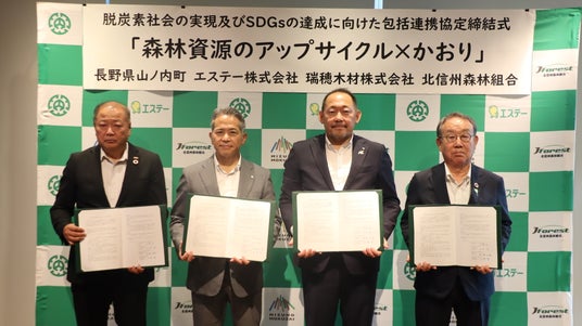 エステー株式会社は、脱炭素社会の実現及びSDGsの達成に向けた「包括連携協定」を長野県山ノ内町、瑞穂木材株式会社、北信州森林組合との四者間にて締結しました。