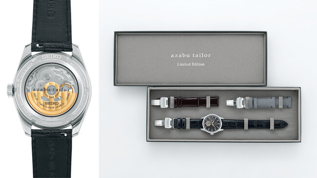 コラボレーションモデルならではの特別仕様として、裏ぶたには「Limited Edition」の表記とシリアルナンバーを、ガラス部分には麻布テーラーのロゴマークを記しています。麻布テーラーのロゴマークが表記された専用ボックスには付属のレザーストラップを収納可能です。