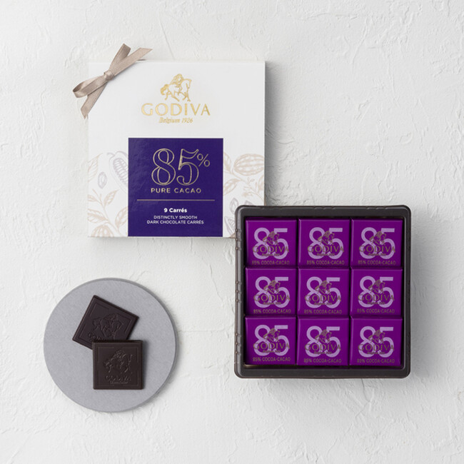 ゴディバのチョコレートへのこだわりが際立つ、薄いスクエアタイプのカカオ分85%のダークチョコレートを9枚詰め合わせました。奥深く洗練された苦みと酸味が織りなすカカオ本来の味わいをお楽しみください。