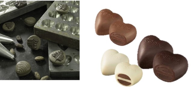 ゴディバは、さまざまな大きさや形のチョコレートをつくるために、エンロービングとシェルモールディングという2種類の方法を使っていますが、左右対象のチョコレート「クール」は、2つの同じ型で作られたものを合わせる「ブックモールディング」によって作られています。