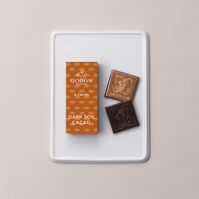 カカオ分50%、ほろ苦い甘さと香りをバランスよく楽しめるまろやかな味わいのダークチョコレートを、4枚詰め合わせました。