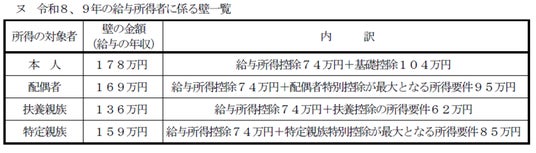 令和8年、9年分について、課税最低限は給与収入に換算して、基礎控除62万円、基礎控除の加算額42万円、給与所得控除の最低保障額74万円の合計178万円になり、令和6年12月11日の三党(自民、公明、国民)合意による金額が実現されたことになります。