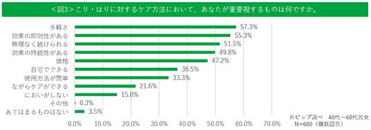 ・こり・はりに対するケア方法において、「手軽さ(57.3%)」「効果の即効性(55.3%)」