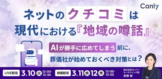 Google ビジネスプロフィール、Yahoo!プレイス、Appleマップなどの3大地図媒体、HP、アプリ、SNSなどの店舗集客媒体の一元管理サービス「カンリー店舗集客」の開発・提供を行う株式会社カンリー(所在地:東京都品川区、代表取締役:辰巳 衛,秋山 祐太朗)は2026年3月10日(火)・11日(水)・12日(木)の3日程で葬儀業界向けセミナー「ネットのクチコミは、現代における『地域の噂話』。 AIが勝手に広めてしまう前に、 葬儀社が始めておくべき対策とは?」をオンライン開催いたします。