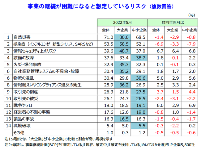 BCPの『策定意向あり』とする企業のうち、事業継続が困難になると想定するリスクでは、「自然災害」が71.0%でトップ。新型コロナウイルスなど「感染症」(53.5%)は前年から大幅に低下した一方、「情報セキュリティ上のリスク」(39.6%)、「物流の混乱」(30.4%)、「戦争やテロ」(19.0%)といった項目が大幅に上昇した