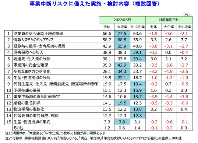 そこで、帝国データバンクは事業継続計画(BCP)に対する企業の見解について調査を実施した。本調査は、TDB景気動向調査2022年5月調査とともに行った。
