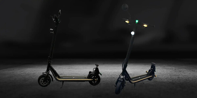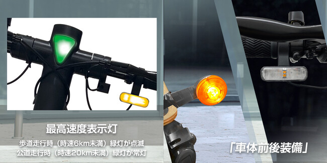 識別点滅灯(最高速度表示灯)、ウィンカー(前後に装備)、ヘッドライト、バックミラー、警音器、テールランプ、およびナンバー灯が装備されています。特に、明るく大きな前照灯やウィンカーは、最大50mの距離からでも見やすく、価格も7万円代という点で、歩道および公道での走行が可能な特定小型区分の電動キックボードとしては非常に手頃です。