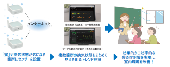 各所に設置されたWiFi/LTE 内蔵のCO2 センサーにより、室内の二酸化炭素濃度および温度・湿度を測定し、換気状態などの室内環境を見える化するサービスです。