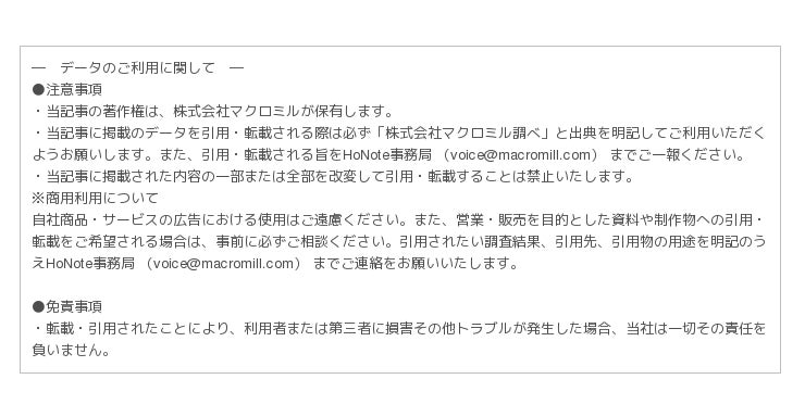 また、当ニュースレターでご紹介する調査のすべての集計結果は、HoNote(https://honote.macromill.com/report/20190402/?utm_source=release&utm_medium=page-link&cid=SL-PR)より無料でダウンロードいただけます。