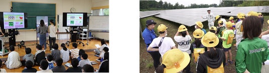 写真左:2拠点の小学校をオンラインでつないだリモート授業の様子 写真右:太陽光発電所見学の様子