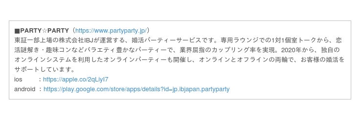 株式会社IBJ(代表取締役社長:石坂 茂、東証一部:6071)が運営する婚活パーティーサービスの「PARTY☆PARTY」は、定員が半数を下回った場合、次回参加費が無料となる「全額保証キャンペーン」を実施し、初めての方も安心してご参加いただきやすくなりました。