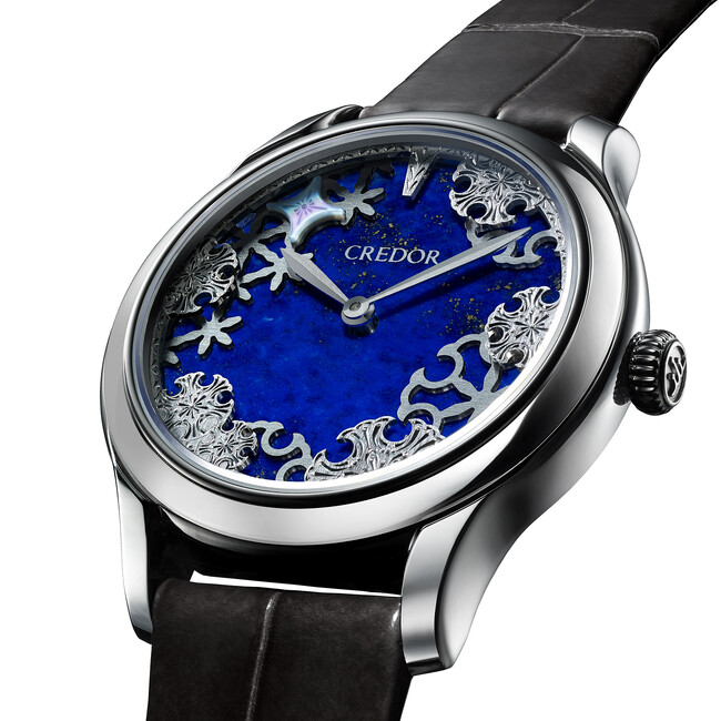 ダイヤルのベースにはラピスラズリを用いて、無数の星が輝く夜空を表現しました。その上に、はらはらと降る雪を表現した雪華・雪輪模様をシルエットで型抜きしたプレートと、雪華・雪輪模様の彫金を施したプレートを重ねています。また、ひときわ輝く星は11時位置の繊細な彫刻を施した白蝶貝で表現しています。