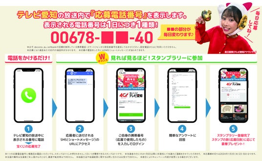 1.テレビ愛知の放送中に表示される番号に電話→2.送られてくるSMS(ショートメッセージ)のURLにアクセス→3.応募に使用したご自身の携帯番号を入力してログイン→4.簡単なアンケートに回答→5.スタンプラリーの登録完了