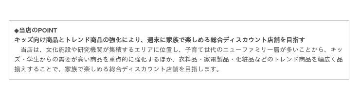 商 品 構 成:食品、生鮮(青果・鮮魚・精肉・惣菜)、酒、日用消耗品、家庭雑貨品、衣料品、化粧品、