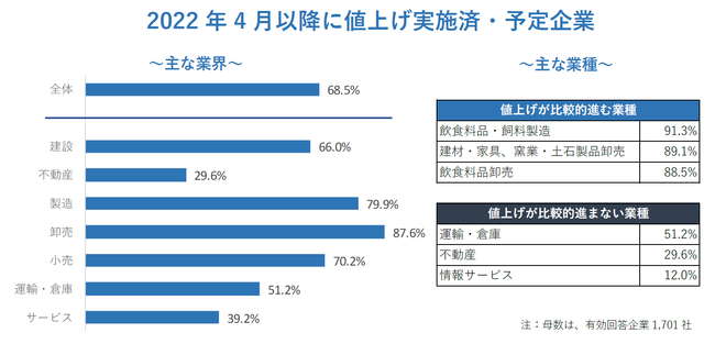 他方、「情報サービス」(12.0%)、「不動産」(29.6%)、「運輸・倉庫」(51.2%)の業種では、値上げを実施している企業の割合が低くなった。「値上げして自社のビジネスチャンスを損ないたくない」(ソフト受託開発)、「値上げをすれば契約打ち切りのリスクがかなり高い」(一般貨物自動車運送)と、他社との競合などから、人件費や燃料費などの上昇分を転嫁しにくい状況がうかがえる。