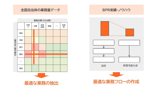 1.〔業務標準化モデル〕 ガバメイツが保有する「全庁業務量調査データ」から、業務分類(55種)×作業分類(38種)で類型化します。その中で標準化・共同化に適した業務(職員の業務負荷が高く、デジタル活用効果が高い業務)を抽出し、業務別に、最適な業務フローのモデルを作ります。さらに、最適な業務フローを実現するための各種ソリューション(システムやBPO)の最適な組み合わせをテンプレートとしてまとめます。これらを活用することで自治体は、業務時間の削減かつ費用対効果の高いシステムやBPOの導入が可能になります。