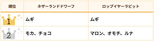 うさぎの人気品種である「ネザーランドドワーフ」と「ロップイヤー」の両部門で1位と、「ムギ」人気が際立つ結果となりました。