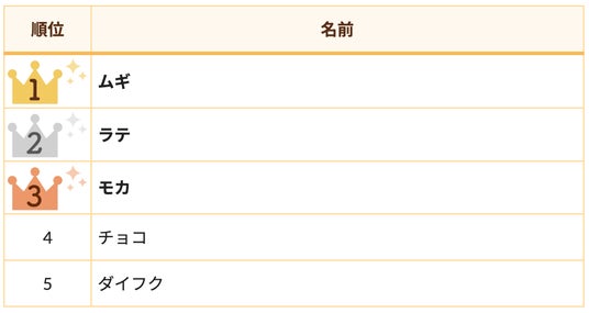 2位は「ラテ」3位は「モカ」と飲み物や食べ物にちなんだ名前が並びました。