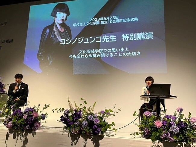 来賓祝辞に続き、卒業生のデザイナー コシノジュンコさんのトークショーが雑誌装苑編集長の児島幹規さんの司会で行われ、ファッションの道を選んだきっかけ、恩師の小池千枝先生や生涯の友である高田賢三さん、金子功さん、松田光弘さんとの思い出、装苑賞を史上最年少で受賞したときの話など興味深い講演が開かれました。