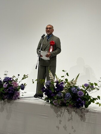 清木 孝悦 学校法人文化学園理事長の式辞のあとに登壇し、関東大震災、戦争を経て、昨今の少子化が進む社会情勢の激しい変化の中でひとつの学校が生き続けることへの賛辞と、在学中の思い出、自身が卒業後、デザイナーとして経営者としてアパレル業界に約40年、携わってこられたのもひとえに理事長、学長をはじめとする先生方のご厚情の賜物であることへの感謝の念と、最後に次の100年の人材育成に向けた学園のさらなる発展への祈念を祝辞として述べました。