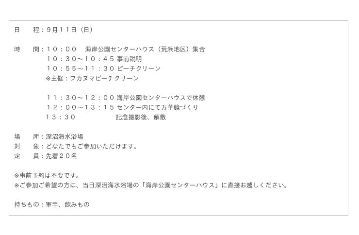 9月11日(日)10:00~13:30の間、深沼海水浴場で毎月第2日曜日に行われている、深沼ビーチクリーン(主催:フカヌマビーチクリーン)活動に参加したあと、ビーチクリーンで拾ったプラスチック片やシーグラス、貝殻などを使い、リサイクル万華鏡づくりを行います。ビーチクリーンとリサイクル万華鏡づくりを通じて、海洋ごみ問題を身近に感じていただき、環境について学べるイベントです。