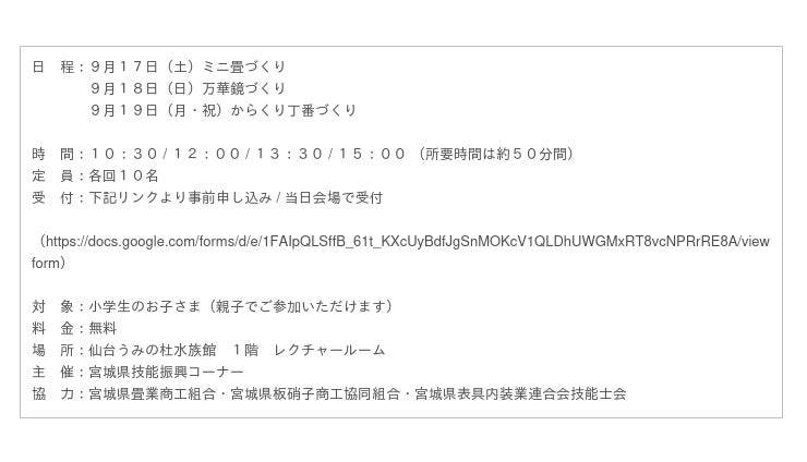 9月17日(土)~19日(月・祝)の3日間、厚生労働省が認定した、高度な技能と長年の実務経験を有している専門家である“マイスター”がものづくり体験のレクチャーを行います。(主催:宮城県技能振興コーナー)17日(土)には「ミニ畳づくり」、18日(日)万華鏡づくり、19日(月・祝)からくり丁番づくりをご体験いただけます。日本を代表する伝統技能を専門家から学ぶことができます。