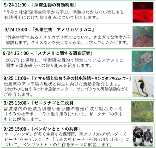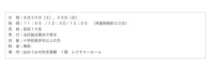 9月24日(土)、25日(日)は、宮城・東北とゆかりの深い生きものの調査・研究や、地域のみなさまと連携した環境保全活動について、飼育員が教える「大人も学べるサステナブル授業」を行います。これまで当館が行ってきた取り組みを通じて、現在我々が直面している環境問題について学び、持続可能な社会の実現に向けてどのような行動をしていけばよいのか考えるきっかけを提供いたします。また、お客さまとの交流を通じて、さまざまな意見を伺い、地域のみなさまと共に考え、環境問題解決への一助となるようなアクションを追求してまいります。
