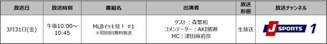 そして、開幕日の3月31日(金)からは、MLBの魅力を発信するMLB情報番組「MLBイッキ見!」を毎週金曜日の午後10時より初回BS無料放送でお届けいたします。