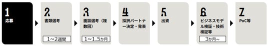 第1弾の2つのテーマにエントリーいただいた企業の中から、NTT西日本にて書類選考を実施し、書類選考を通過した企業と複数回の面談を行い、採択パートナー企業を決定します。採択パートナー企業が希望する場合には、NTTグループのコーポレートベンチャーキャピタルであるNTTファイナンスより出資を行います。