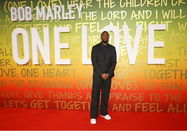 トシン・コール (Tosin Cole) はブラック ウールジャケットとトラウザー、ホワイト レザーボックススニーカーを 着用しています。