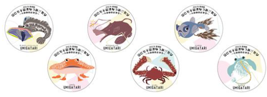 今回紹介している生きもののうち、生態展示3種、パネル展示3種が缶バッジになりました!デザインは生きものの特徴が入った『うみがたり』完全オリジナル!コンプリートを目指してみてはいかがでしょうか。