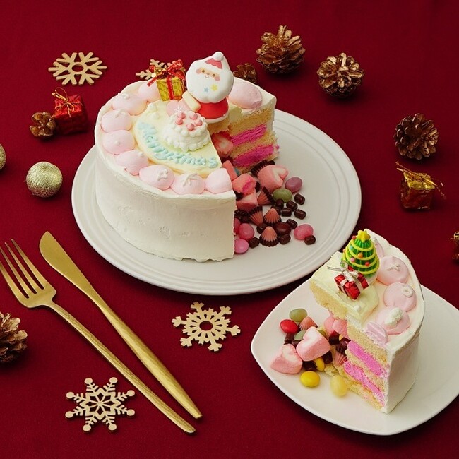 「サンタさんと一緒にクリスマス会を楽しもう!」というイメージで作られたケーキ。ケーキをカットすると、鮮やかなピンクのクリームと、お菓子が溢れ出す、パーティの演出にぴったりなケーキです。ケーキが苦手なお子様にも楽しんでいただけると思います。