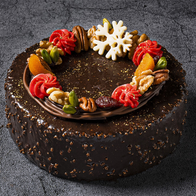 チョコレートの優しい甘さが広がるスポンジ生地、オレンジとアプリコットの甘酸っぱいジュレ、ナッツのザクザク食感が楽しいほろ苦いチョコレートガナッシュ、すべてがバランス良くあわさり、コク深い味わいに仕上がりました。ご家族で、お友達と、様々なシーンでお楽しみいただけるCake.jpオリジナルXmasケーキです。