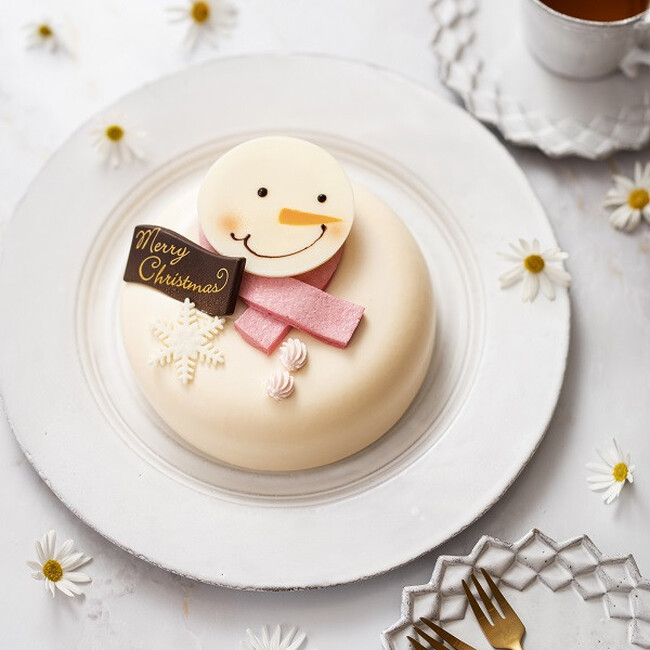 爽やかな酸味のフランボワーズのジュリフィエとアーモンド風味のジェノワーズ生地、フランボワーズとミルクチョコレートのムースをなめらかなマルカルポーネムースで包みました。ラズベリー風味のギモーブをマフラーに見立て、雪だるまをモチーフにしたホワイトチョコレートのプレートを飾りました。