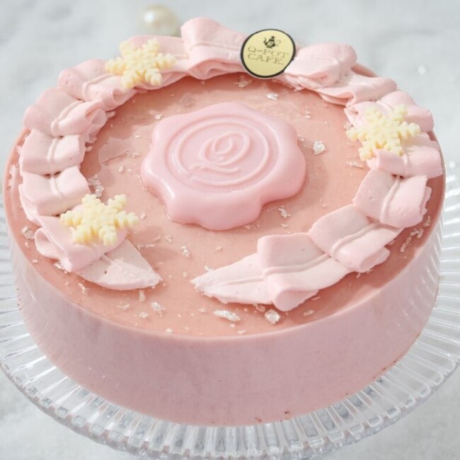 ブランドロゴの「Q」を象ったミルクゼリーと、大きなリボンで大胆にデコレーションされたストロベリームースの中には ピスタチオの風味豊かなクリーミーで色鮮やかなムースと、 甘酸っぱいラズベリー&ストロベリーのジュレ、ふわふわのココアジェノワーズ、 そして食感のアクセントに香ばしいアーモンドダイスを散りばめ、大人好みの上品な甘さのケーキに仕上げました。取り分けた後の断面の美しさにもこだわり抜いた、アクセサリーブランドが手掛ける Q-pot CAFE.ならではの優美なケーキです。大人可愛いらしいモードなピンクで、エレガントにまとめました。