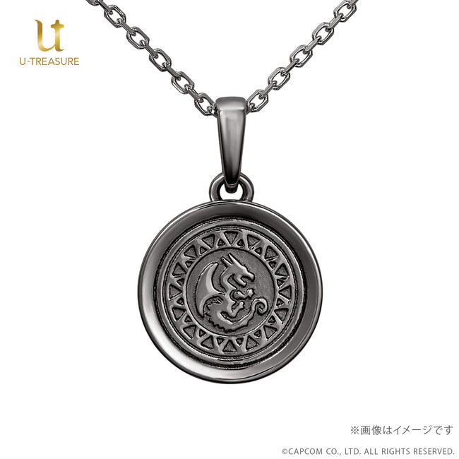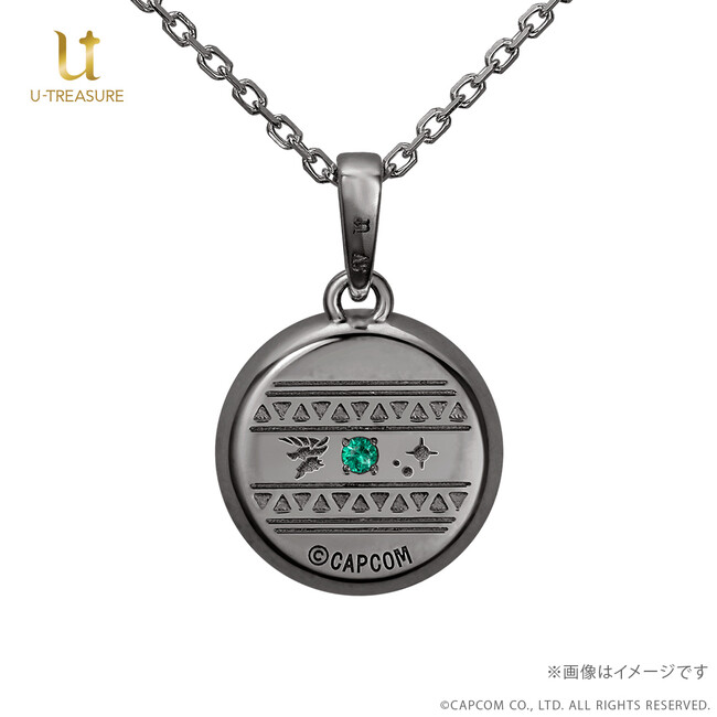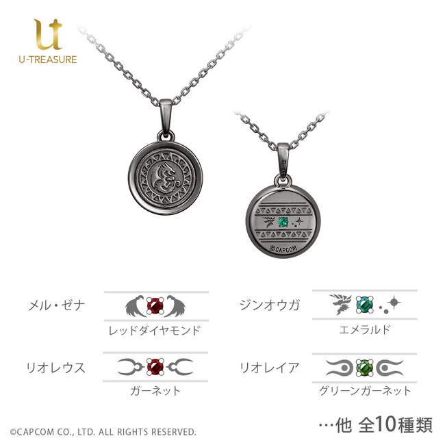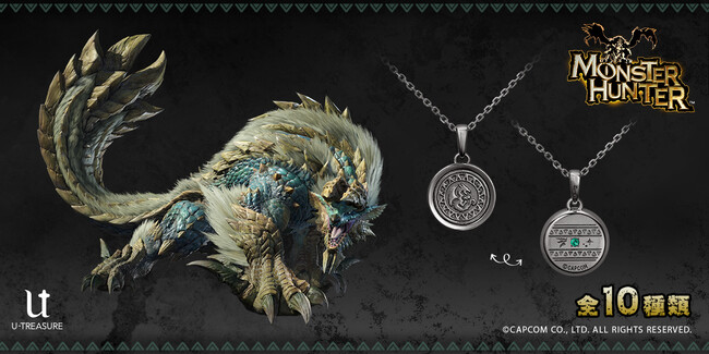 このたびの新作は、ネックレスにブラックコーティングを施し、着用していく中でデニムのようなエイジングを楽しみながら、自分だけのネックレスを作れる仕様です。リオレウス、リオレイアはもちろん、ジンオウガや、最新作『モンスターハンターライズ:サンブレイク』のメインモンスターであるメル・ゼナなど、全10種類をご用意。それぞれのモンスターをイメージした刻印と宝石が裏面にデザインされています。ユートレジャーコンセプトストア池袋、ユートレジャーオンラインショップにてご購入いただけます。