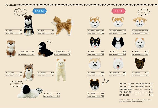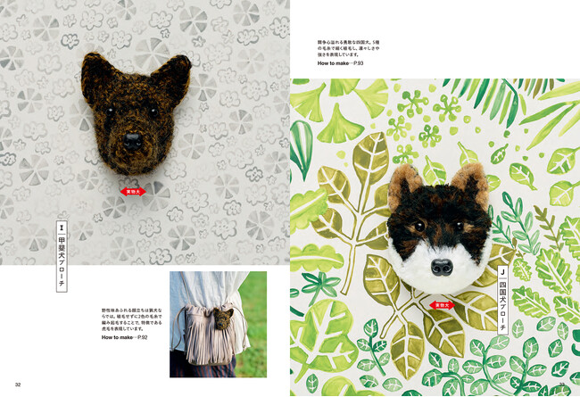 柴犬と表情の似ている、北海道犬、秋田犬、甲斐犬、紀州犬、四国犬、狆もくわえて10点のあみぐるブローチの作り方も紹介します。