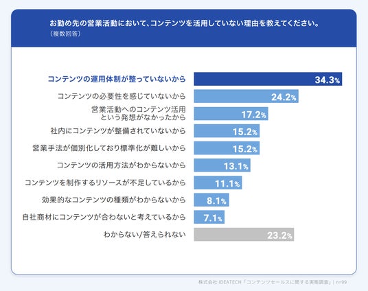 A. 営業コンテンツを作っても「運用体制が整っていない」(34.3%)という理由で活用されないケースが多いためです。社内のどこに資料があるのか分からない、使っても反応が見えない、誰が何を更新するのか決まっていない状態では、ツールがあっても現場で活かされません。営業プロセスの中に組み込み、誰が使い、どう判断するかまでを設計する仕組みが必要です。