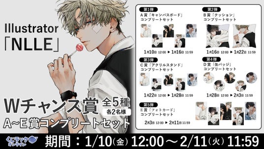 カルチュア・エンタテインメント株式会社は、イラストレーター『NLLE』とのコラボを実施いたします。2025年1月10日(金)より『NLLE』のオンラインくじを、「くじラックオンライン」で販売いたします。 さらに、くじ1枚ご購入ごとにWチャンス賞の抽選が行われ、当選した方は特別な賞品が獲得できます。