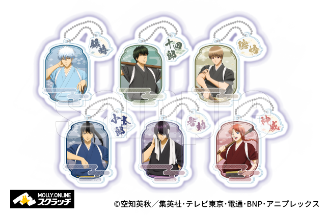 坂田銀時、土方十四郎、沖田総悟、桂小太郎、高杉晋助、神威のイラストを使用したアクリルキーホルダー。