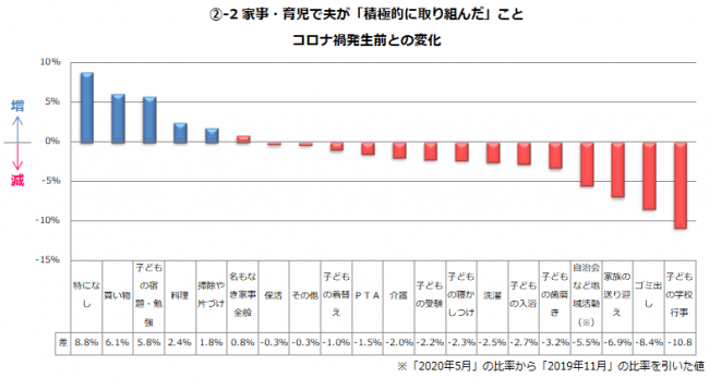 調査ではさらに、「夫が“積極的に取り組んでいる”と思うこと」と「夫が“もっと積極的に取り組んだ方が良い”と思うこと」とのギャップ、またそれぞれについて、コロナ禍発生前との変化について比較を行いました。夫が積極的に取り組んだことと取り組んだ方が良いこととのギャップからは、「買い物」や「ゴミ出し」などの充足感が高く、「名もなき家事全般」や「料理」などは不足感が強いことがわかりました。コロナ禍発生前と後との変化においては、取り組んだこととして最も増加した項目は「特になし」。一方、最も減少した項目は「子どもの学校行事」でした。休校となっていた学校が多かったことが影響していると考えられます。また、取り組んだ方が良いこととして最も増加した項目は「料理」で、反対に最も減少した項目は、取り組んだことと同じく「子どもの学校行事」でした。